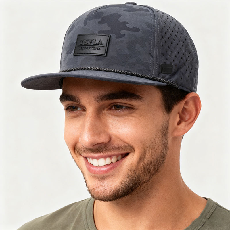 Item numberThis camouflage flat-brimmed baseball cap has a tough and trendy style. The overall color scheme is mainly camouflage. The back of the hat is designed with four perforated pages, providing excellent breathability. The black rubber stamp on the front of the hat clearly and conspicuously features the words "TEFLA", highlighting the brand's quality. The reflective woven rope at the brim of the hat adds a touch of refinement and is suitable for wearing in all kinds of fashionable occasions. TF250801 Product Name: Snapback cap Fabric composition: 100% polyester Color: 58cm |