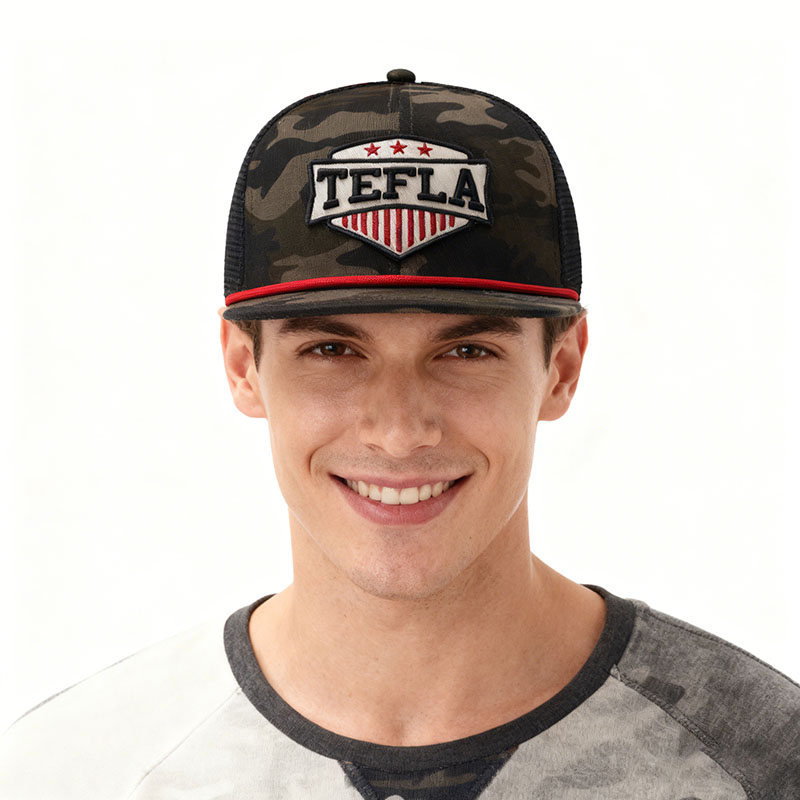Item numberThis camouflage net cap is both fashionable and practical. The hat body is crafted with camouflage patterns, exuding a tough outdoor style. On the front side of the shield-shaped patch, the eye-catching "TEFLA" text, combined with red and white elements and three red stars, is highly recognizable. The black mesh back four pages are breathable and comfortable. The red hat rope adds a bright touch. The overall design is suitable for casual outings or outdoor activities. TF250802 Product Name: Snapback cap Fabric composition: 100% cotton Color: 58cm |