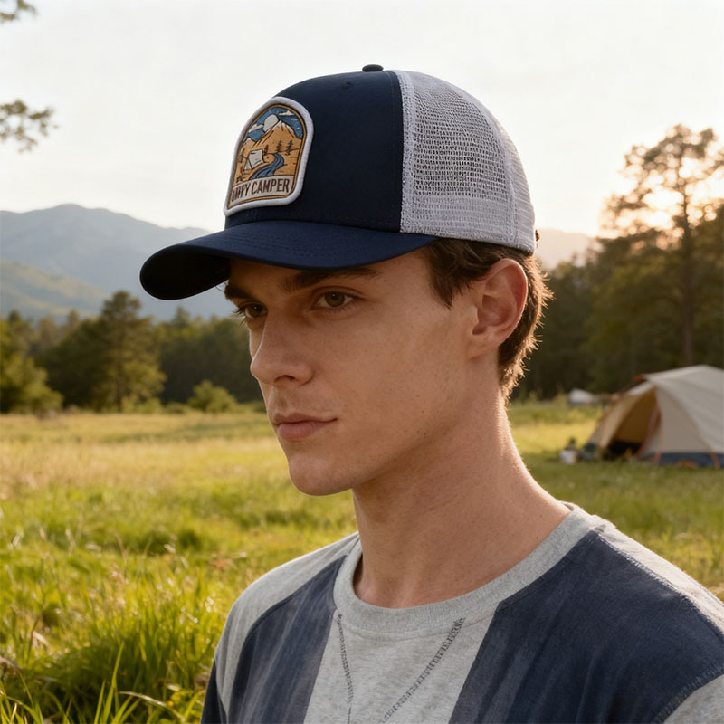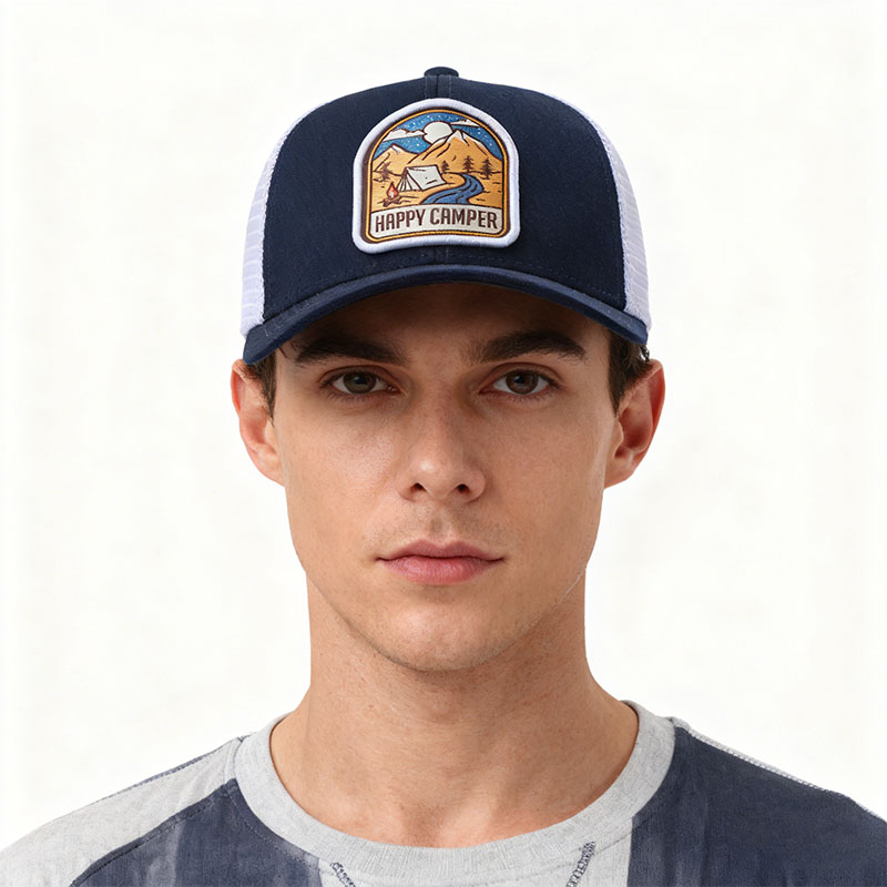 Item numberThis baseball cap is an excellent choice for outdoor enthusiasts. It features a deep blue and white color combination design, which is both fashionable and refreshing. The front side of the hat is embroidered with exquisite camping pattern woven labels, paired with the words "HAPPY CAMPER", fully demonstrating the outdoor charm. The back is made of white mesh material, which is highly breathable and comfortable to wear. Whether it's daily outings or outdoor activities, it can add charm to you. TF250803 Product Name: Trucker cap Fabric composition: 100% cotton Color: 58cm |