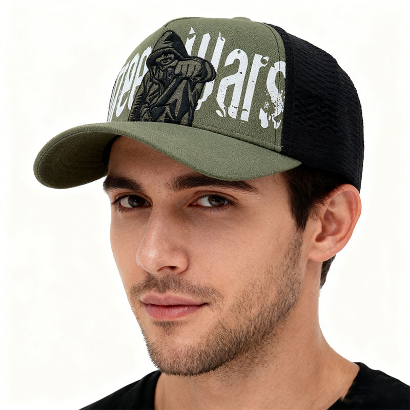 Item numberThis truck cap combines tough and breathable designs. The front piece features a steady olive green tone, with eye-catching white letters paired with black warrior embroidery patterns, highlighting an unrestrained style and military demeanor. The rear is made of black mesh material, which enhances breathability and ensures a comfortable wearing experience. Whether it's street fashion matching or outdoor activities, it can keep you looking cool and stylish at all times. TF250812 Product Name: Trucker cap Fabric composition: 100% cotton Color: 58cm |