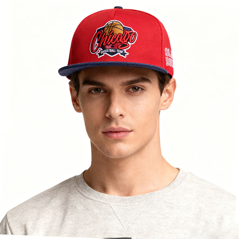 Item numberThis red flat-brimmed baseball cap is passionate and eye-catching, exuding youthful vitality. The main body of the hat is bright red, and the logo of the Chicago basketball team on the front is exquisitely embroidered, with rich colors and a strong sense of layering. The white words "SLAM DUNK" on the side highlight the basketball theme, and the blue and grey brim adds a sense of design. It is not only suitable for football fans to wear but also a fashionable choice for trendsetters. TF250902 Product Name: Snapback cap Fabric composition: 80% acrylic, 15% wool Color: 58cm |