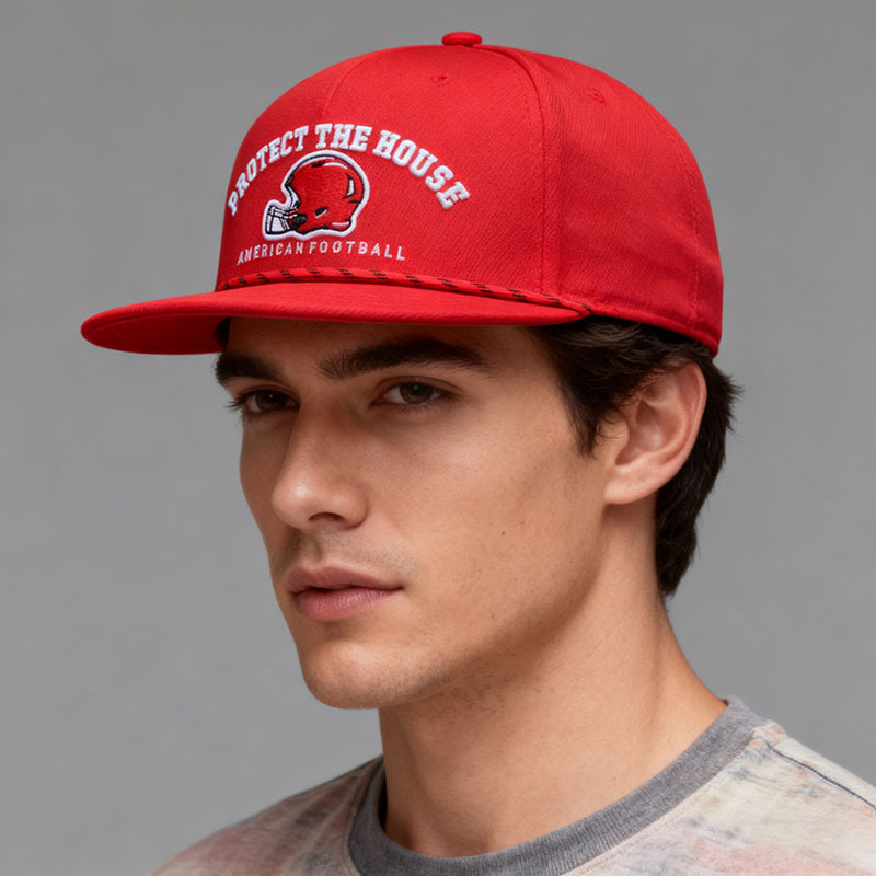 Item numberThis red flat-brimmed baseball cap is full of vitality and passion. THE bright red cap body is eye-catching. The exquisite embroidery pattern on the front, combined with the words "PROTECT THE HOUSE" and "AMERICAN FOOTBALL", highlights the theme of American football and conveys the spirit of sports. The detailed design of the brim adds a unique touch, making it an ideal choice for both sports and fashion enthusiasts. TF250903 Product Name: Snapback cap Fabric composition: 80% acrylic, 15% wool Color: 58cm |